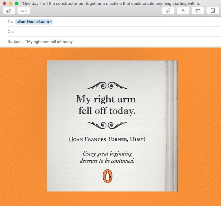 When the beginning is intriguing, it's almost impossible to not want to know what comes next. Using first lines from great books as headlines, the campaign teases people to continue reading the stories. Besides posters, we also developed the idea into banners and e-mail marketing subjects, where the reader would have to click to find out what each intriguing line is about.